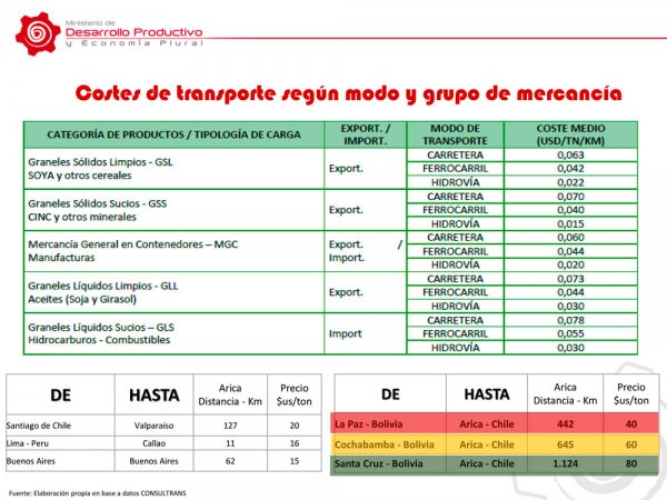 Puntualizó que los costos de transporte y servicios portuarios exigidos por Chile deben pagarse en moneda dura, lo cual representa un apreciable drenaje de divisas en favor del vecino país, debido a que un alto porcentaje de recursos está destinado al pago de servicios de transporte y seguro.