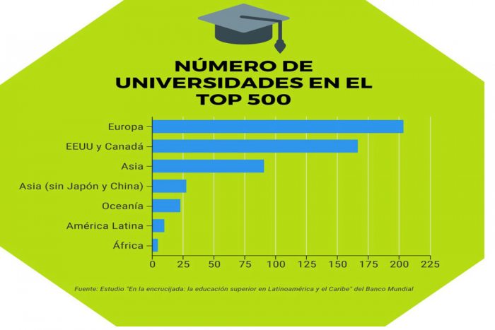 En el caso de las universidades, América Latina está con un número bajo en el top de universidades, según el estudio del Banco Mundial, mientras Europa toma la punta, seguida de Estados Unidos y Canadá.
