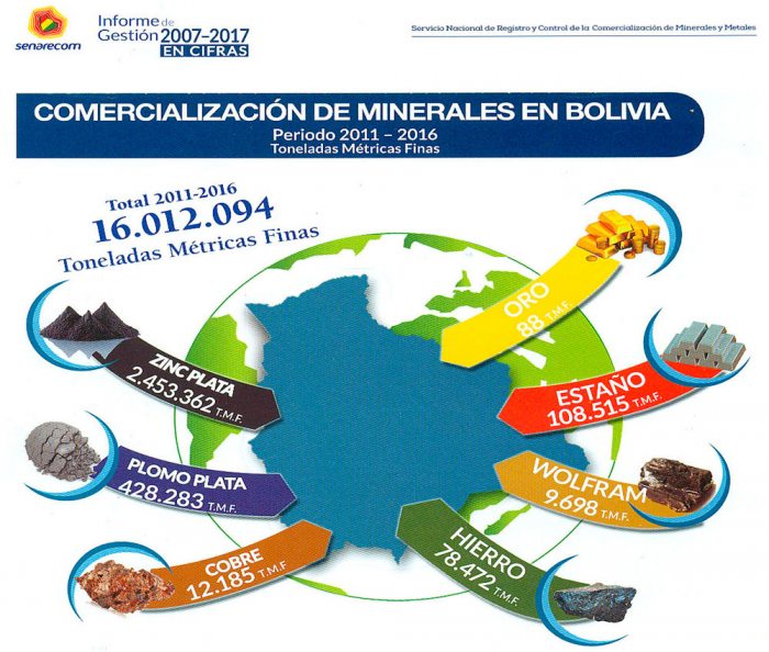 Un informe del Servicio Nacional de Registro y Control de Comercialización de Minerales y Metales, (Senarecom) estableció que, entre 2011 y 2016, se comercializaron 16.012.094 Toneladas Métricas Finas (TMF), de las cuales 88 corresponden al oro. Existen 51 tipos de minerales que se explotan a nivel nacional