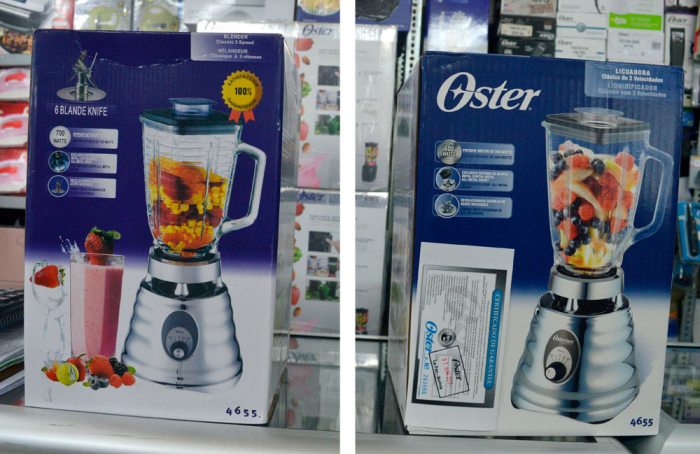 “Cada vez se hace más difícil el reconocer un producto original de uno falso de Oster, primero porque falsifican la marca con un sticker o pintan el logo de tal manera que lo hacen parecer verdadero y, segundo, porque incluyen regalos como vasos de llajua o cuchillas que no vienen con el producto”, asegura Arancibia.