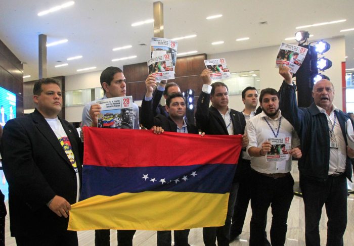 Una decena de venezolanos, que portaban una bandera de su país, entraron de manera intempestiva al auditorio del hotel Moon Palace, sede de la cita regional.