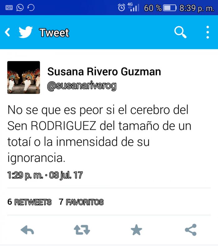 “No se qué es peor si el cerebro del Sen RODRIGUEZ del tamaño de un totaí o la inmensidad de su ignorancia”. “Meritocracia es suma de currículums, estudios, experiencia laboral + examen d competencia. Parece q ignorancia del Sen Rodriguez es abismal”, (textual) publicó Rivero.