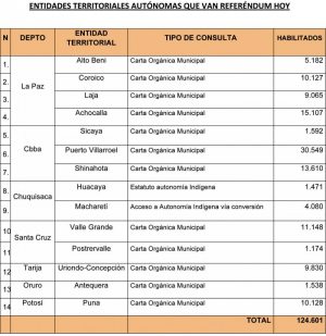 Hoy, domingo, 124.601 ciudadanos de 14 entidades territoriales autónomas (ETA) en siete departamentos del país acuden a urnas electorales para definir su respaldo o rechazo al proceso autonómico de su región. Hoy se realiza el referéndum por Estatutos Autonómicos y Cartas Orgánicas.