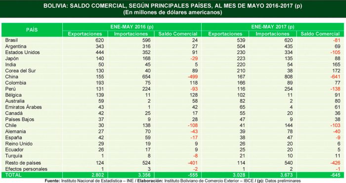 Durante los primeros cinco meses del 2017, Bolivia registró nuevamente un déficit comercial, esta vez de 645 millones de dólares, 16% más que el déficit registrado a mayo de la pasada gestión, precisó el último un reporte del privado, Instituto Boliviano de Comercio Exterior (Ibce).