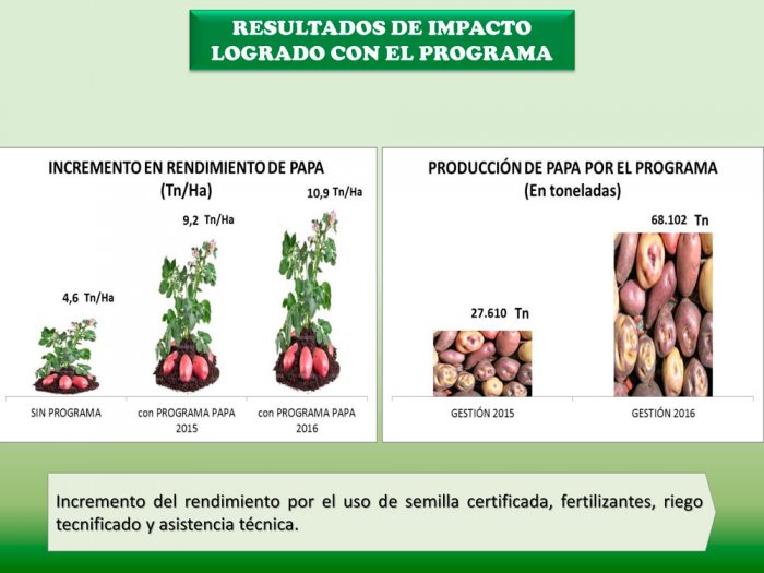 Ejemplificó que la productividad de la papa, si bien cuenta con semilla mejorada, riesgo y asistencia técnica, es diez veces menor a la que registra Argentina. El presupuesto ejecutado en el programa de mejoramiento, llegó a Bs 124 millones el año pasado. Rojas hizo tales aseveraciones durante la rendición de cuentas 2016 que hace cuatro meses presentó en la sede de Gobierno.