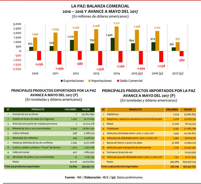 Durante todo el período 2010 - 2017, La Paz registró déficit en su balanza comercial, acumulando un total de 9.676 millones de dólares producto del desbalance comercial.