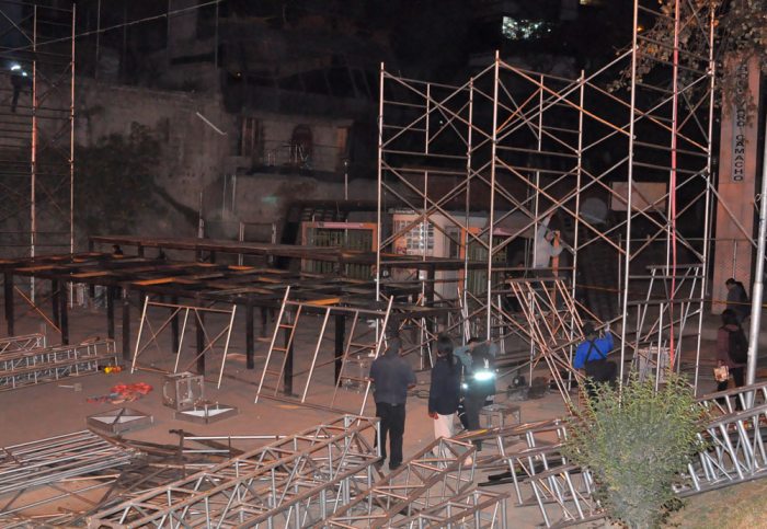 A tres días del espectáculo, la empresa “Yes Producciones”, ya comenzó a instala la tarima de 12 metros de largo, perjudicando la libre circulación de los peatones y poniendo en riesgo su integridad física, debido a que no existen cordones de seguridad o señalética que advierta sobre el peligro de circular por ese sector.