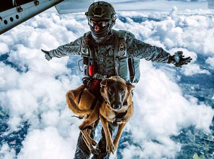 La historia de los perros paracaidistas se remonta a 1944 y va de la mano del famoso desembarco de Normandía. Los primeros perros paracaidistas se vieron por primera vez en el 13º Parachute Regiment and Airborne Forces (Regimiento de Paracaidistas y Fuerzas Aerotransportadas), al que estaban asignados tres perros: Bing, Monty y Ranee.
