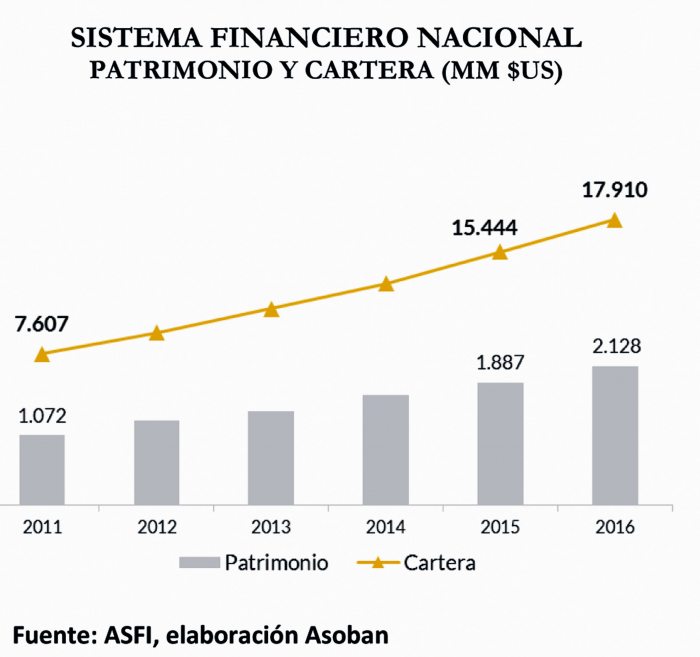 Un comunicado de la entidad sostuvo que hasta diciembre de 2016, el patrimonio del sistema bancario aumentó a $us 2.128 millones, es decir, $us 241 millones más que la gestión inmediatamente anterior, como producto de la continua reinversión de utilidades generadas por los bancos.