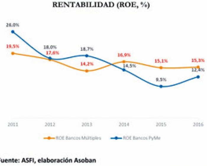La entidad señaló también que en 2016 la rentabilidad alcanzó 15,3% en el caso de los Bancos Múltiples, mientras que en los Bancos Pyme fue 12,4%. El informe añade que “es preciso hacer notar que desde hace algunos años se aprecia una tendencia a la baja en ambos casos”.