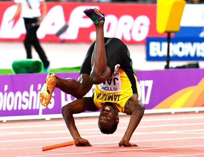 A media recta, Bolt se trastabilló y cayó al suelo entre gestos de dolor. Allí permaneció durante dos minutos, ocultando su cara con las manos, antes de incorporarse para entrar caminando en la meta. La medalla de oro fue para Gran Bretaña, que con un crono de 37.47 batió al equipo favorito, Estados Unidos (37.52), y a Japón (38.04). Un adiós doloroso para tal vez el atleta más grande de todos los tiempos, que se acercó lentamente a la meta acompañado por sus tres compañeros de relevos en la escena más dramática de los campeonatos del mundo.