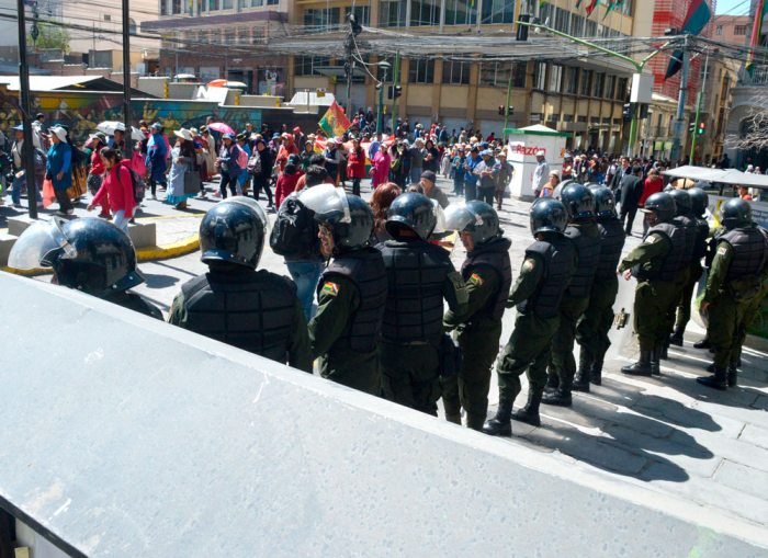 La violenta movilización recorrió la avenida Mariscal Santa Cruz, para luego dirigirse hacia el edificio de la comuna, donde se apostaron y provocaron amagos de enfrentamientos con la Policía. Los agresivos comerciantes haciendo uso de petardos y botellas de plástico con piedras intentaron provocaron a los policías que tuvieron que hacer uso de gas pimienta para despejar a los manifestantes.