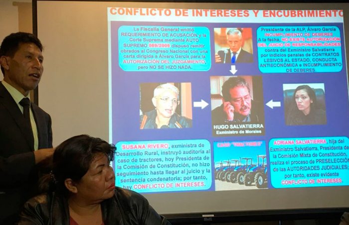 La oposición denunció que las legisladoras del Movimiento al Socialismo (MAS) Adriana Salvatierra y Susana Rivero incurren en delito por intereses personales. Considera que es inaceptable que Salvatierra esté a cargo de la preselección de los futuros magistrados que juzgarán a su padre, porque existe contra él un juicio de responsabilidades desde el 2009.