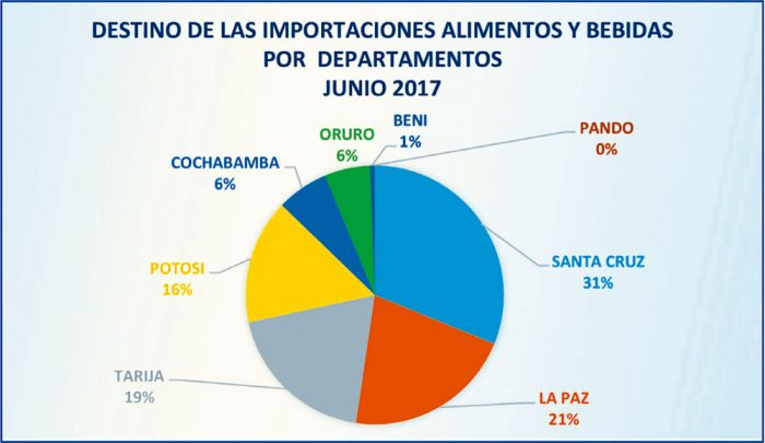 Santa Cruz con 31%, La Paz con 21% y Tarija con 19% son los departamentos que registran mayores valores en importaciones de alimentos y bebidas.