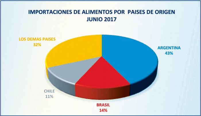 Argentina con 43% es el país de donde se realizan las mayores importaciones de alimentos y bebidas, seguido de Brasil con 14% y Chile con 11%.