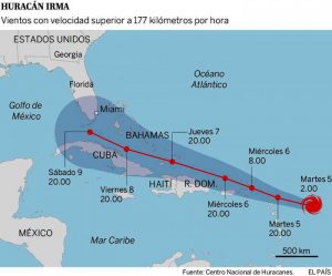 El huracán Irma, el mayor jamás registrado en el océano Atlántico, con una longitud de unos 200 kilómetros y vientos sostenidos de 300 kilómetros hora, continúa su amenazante trayectoria de entrada por...