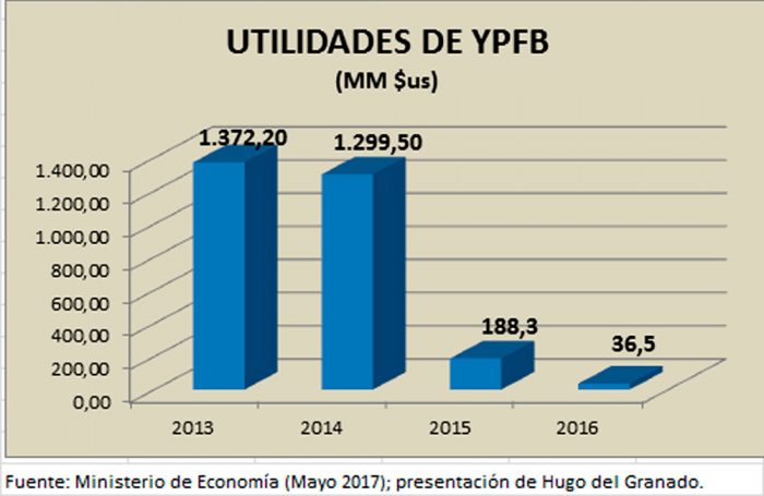Según el cuadro que presentó Del Granado, en el evento de la Gobernación, YPFB en 2013 sumó utilidades de $us 1.372,2 millones, en 2014 la cifra fue de $us 1.299,5 millones, en 2015 la cifra ha sido de $us 188,3 millones y en 2016 descendió a $us 36,5 millones.