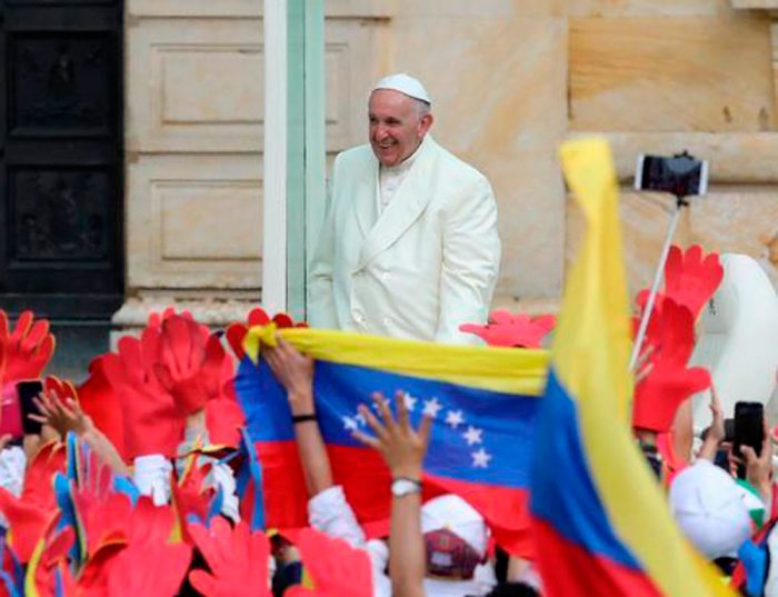Ataviados con banderas y gorras de su país, los venezolanos esperaron al obispo de Roma, que hizo un recorrido de 6,1 kilómetros en el papamóvil que lo llevó desde la Plaza de Bolívar, en el centro de Bogotá, hasta la Nunciatura Apostólica, luego de la visita a la Casa de Nariño (sede del Gobierno) y del saludo a los jóvenes.