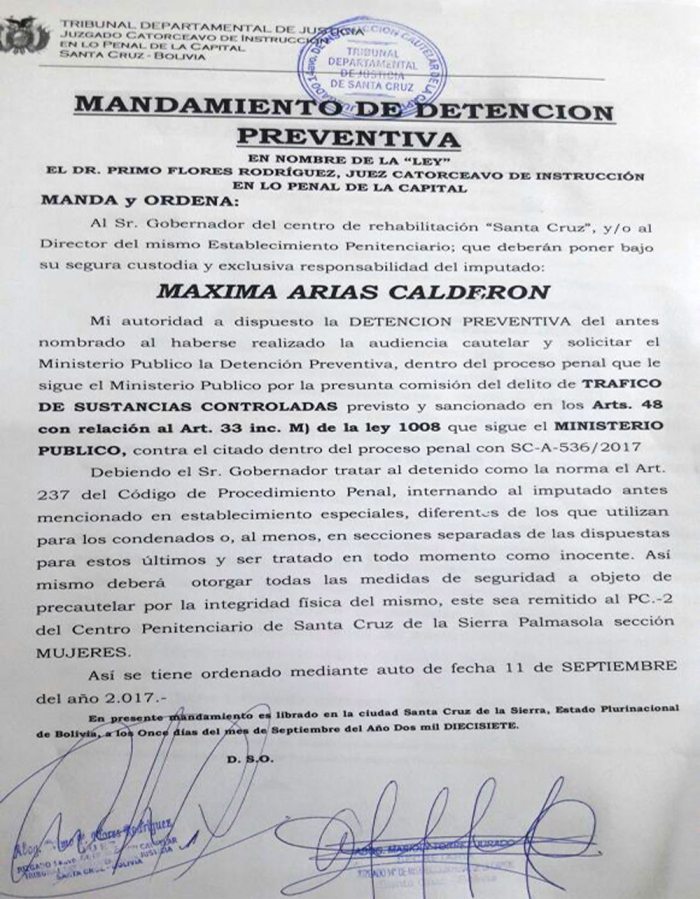 Monasterios mostró documentos y aseguró que Máxima Arias Calderón (47 años de edad) fue detenida por efectivos de la Fuerza Especial de Lucha Contra el Narcotráfico (Felcn) en un domicilio de la calle 6 de Junio del barrio Samaria, en posesión de 10 ‘ladrillos’ de cocaína con un peso de 10.480 gramos.