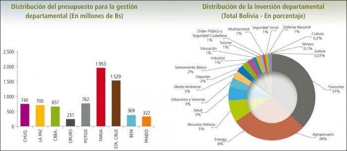 En comparación con el año anterior, el presupuesto para la gestión departamental desciende en 11%, lo que implica que de 8.149 millones de bolivianos se redujo a 7.262 millones. La Inversión programada desciende en casi el 34%.
