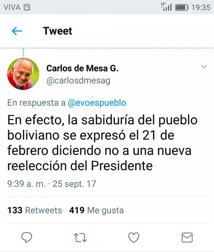 “En efecto, la sabiduría del pueblo boliviano se expresó el 21 de febrero diciendo no a una nueva reelección del Presidente”, escribió Carlos Mesa.