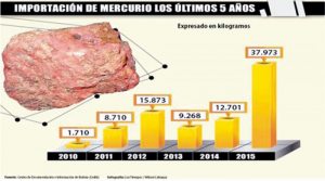 Bolivia importó en 2015 alrededor de 40 toneladas de mercurio, cifra que ha ido en constante incremento desde 2010. El metal pesado se utiliza en el laboreo de las cooperativas mineras auríferas para separar el metal precioso de otros minerales, como cadmio, plata, cobre, plomo o bismuto dijo el experto y docente universitario Agustín Cárdenas.