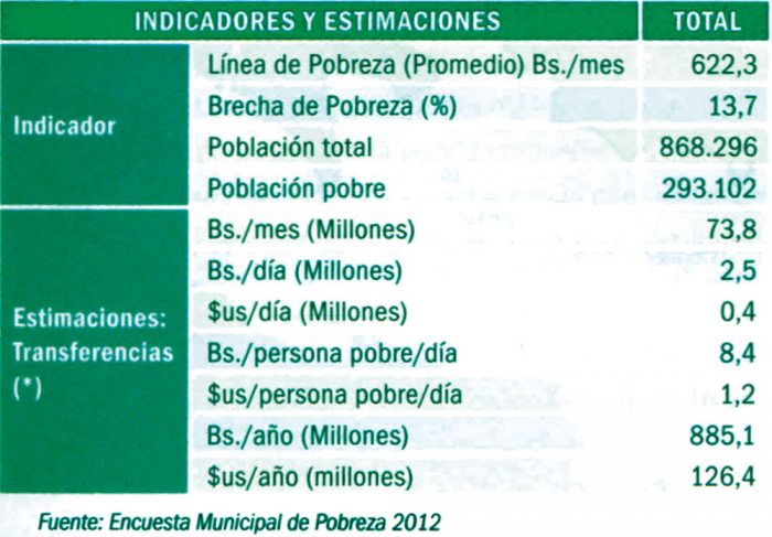 El estudio “Medición de la Pobreza en La Paz” realizado por la Secretaría Municipal de Planificación para el Desarrollo señala que de los 852.438 habitantes del municipio de La Paz, según el último Censo Nacional de Población y Vivienda, 293 mil personas viven en la línea de la pobreza; pero según criterio más amplios vinculados al acceso a servicios básicos este indicador asciende aproximadamente al 55%, indica el documento.