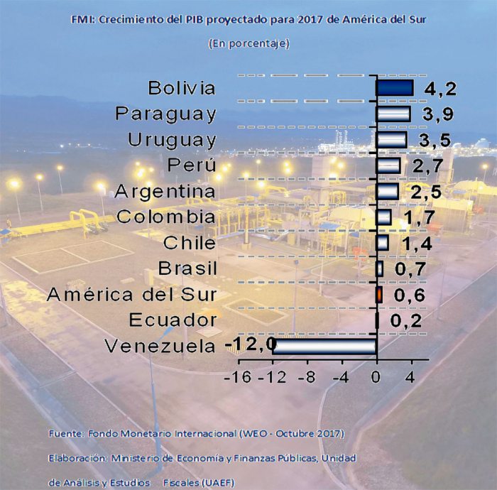 En comparación al informe de abril 2017, el organismo internacional ha mejorado su previsión para seis países, entre ellos Bolivia en 0,2 puntos porcentuales de 4,0% a 4,2%; y redujo su proyección de crecimiento para cuatro economías (Chile, Colombia, Perú y Venezuela).