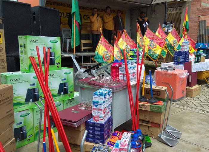 De la misma forma, se entregó material de escritorio, material de limpieza y material de talleres valuados en 352.150 bolivianos.