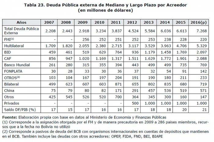 La publicación de Milenio recordó que el saldo de la deuda externa pública de mediano y largo plazo aumentó en $us 655 millones, ascendiendo de $us 6.613 millones en 2015 a $us 7.268 millones en 2016.