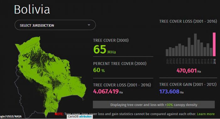 Según los datos del sitio web, el país mostró que entre 2001 y 2016 tuvo la pérdida de 4.067.419 hectáreas de la masa forestal acumulada. Entre 2001 y 2012, la ganancia de la cobertura forestal fue de apenas 173.608 hectáreas. Bolivia tenía 60 por ciento de su superficie con cobertura forestal en 2000, equivalente a 65 millones de hectáreas.