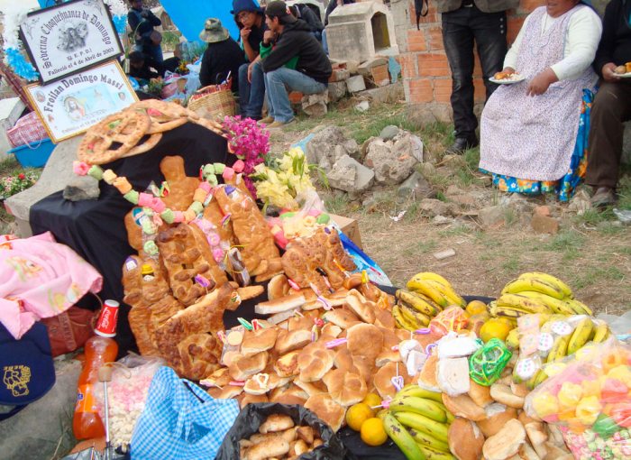 Luego viene el espacio donde se colocan las bebidas, las comidas, las galletas, la tantawawa, caballos, llamas, todos hechos de la masa de pan y de la misma manera están presentes las bebidas, refrescos, cerveza, coca, frutas, biscochuelos, dulces y masitas.