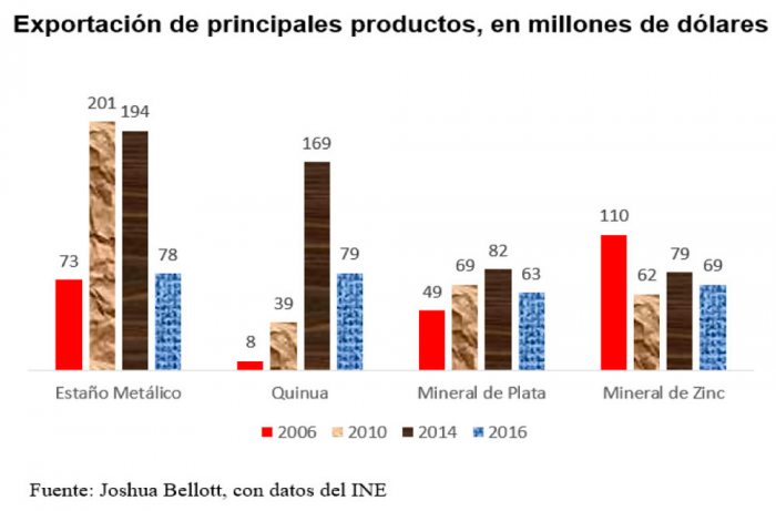 “La caída de las exportaciones de concentrados arrastra a la exportación de productos metálicos (estaño y plata) que desde un valor máximo de $us 279 millones en 2010 se han reducido a $us 242 millones en 2016. Son precisamente las fluctuaciones de las exportaciones mineras las que configuran la alta volatilidad en el crecimiento de la economía departamental”, señaló Milenio.