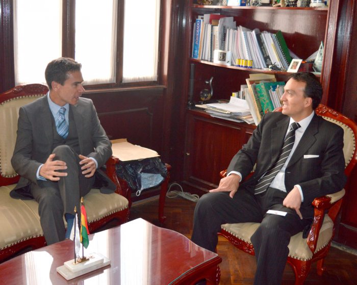 El emisario español abordó diversos temas relacionados con la labor que realiza la Embajada y expresó el interés de su país por trabajar en la integración de las dos naciones, con el objetivo de aportar al desarrollo de Bolivia, a través de la cooperación española en temas relacionados con agua, salud y educación, además del intercambio empresarial, turístico y cultural.