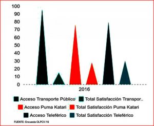 Según cifras de la Olpcv, si bien un 96% de la población afirma tener servicio de transporte público (minibuses, taxis, trufis y micros), próximo a su domicilio, el nivel de satisfacción del usuario es bajo, sólo el 14,6 % de los encuestados afirma sentirse satisfecho con el servicio que recibe frente a un 30,2 de usuarios totalmente satisfechos con el servicio del teleférico o al 27,7% que prefiere el servicio del bus Puma Katari.