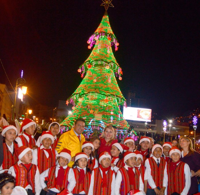 El alcalde de la ciudad, Luis Revilla, y su esposa, Maricruz Ribera, acompañados por cientos de niños y jóvenes encendieron el mayor árbol de Navidad de La Paz, mide 15 metros de alto y está instalado en el atrio de la plaza Mayor de San Francisco.