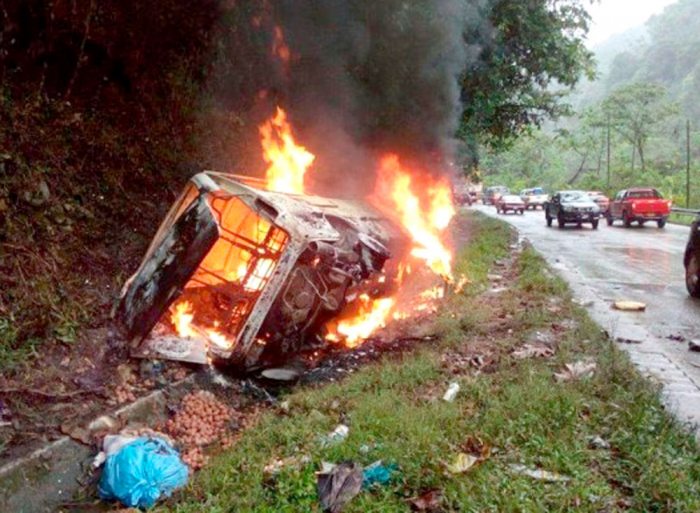 “Un vehículo tipo minibús del Sindicato de Trufis San Gabriel de Villa Tunaria se encunetó y después se incendió cerca a las 11.30 horas a la altura de El Sillar. A causa del accidente perdieron la vida Máxima Mamani (54 años d edad) y Teodosia Herrera de (43), porque no pudieron salir por la llamas y su muerte fue por incineración”, detalló el Policia.