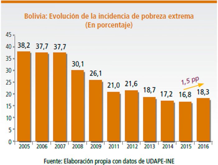 Según el crecimiento del PIB, se advierte que durante el período 2007–2013 las tasas fueron favorables para la reducción de la pobreza, pero en cuanto empezó la desaceleración económica y las tasas de crecimiento comenzaron a ser menores los niveles de reducción de la pobreza extrema también fueron marginalmente inferiores, hasta llegar a la gestión 2016, cuando la pobreza extrema se incrementó y el PIB decreció respecto del año 2015.