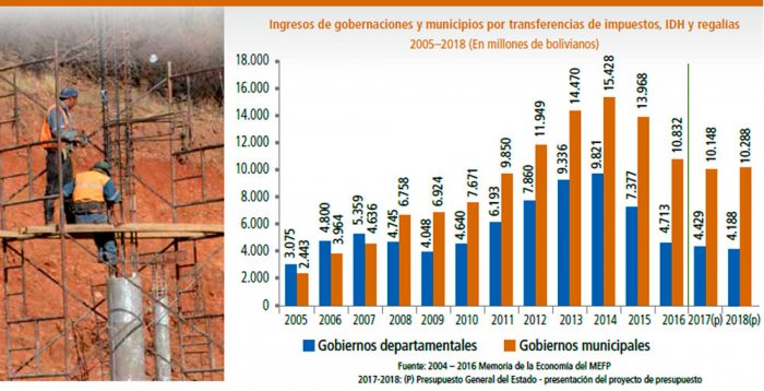 En 2017 continuó la disminución de ingresos del Estado provenientes de hidrocarburos, lo que se registra desde 2015; sin embargo, al parecer, ya se habría llegado al nuevo nivel en el cual fluctuarán estos ingresos, al menos en el corto plazo, incluyendo la gestión 2018. Los ingresos anuales que ahora se reciben por estas fuentes son menos del 40% de lo que se recibía en 2013 y 2014, aproximadamente.
