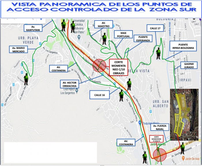 En esta fase, las vías habilitadas para la circulación de vehículos públicos y particulares del centro hacia la zona Sur serán la avenida Kantutani, avenida Costanera y avenida Costanerita.