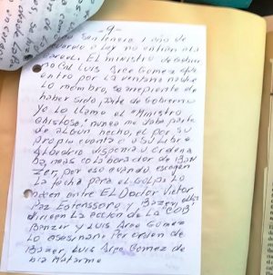 “Cuando escogen la fecha para el golpe de 1980, lo hacen el doctor Víctor Paz Estenssoro y Hugo Banzer Suárez, ellos dirigen la acción contra la COB, en el cual muere un amigo de infancia Marcelo Quiroga Santa Cruz. Por orden de Hugo Banzer Suárez y Luis Arce Gómez lo mandan a matar y por orden de Banzer Arce Gómez debía matarme…”, señala parte de la carta de seis páginas que dejó el general Luis García Meza.