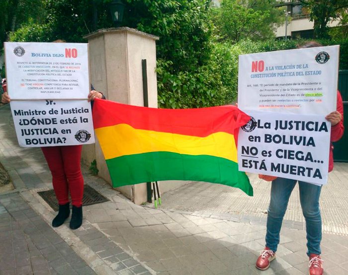 Ayer lunes se apostaron frente a la Embajada boliviana en Madrid con un cartel que titulaba “Bolivia dijo No” y versaba el siguiente texto “El respeto al referéndum del 21 de febrero de 2016 de carácter vinculante, en el que se rechazó la modificación del artículo 168 de la Constitución Política del Estado”.