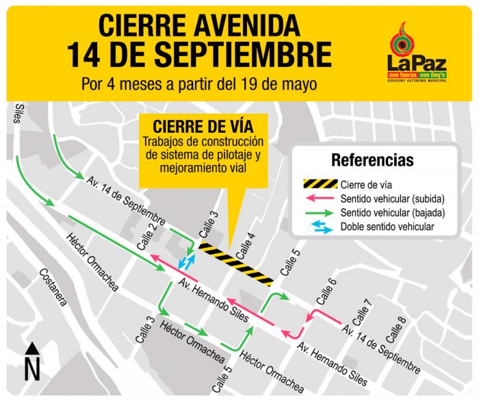La Alcaldía realizó ayer el cierre de la avenida 14 de Septiembre en la zona de Obrajes para la construcción de un sistema de pilotaje a objeto de ejecutar obras de prevención de riesgos. El director de Planificación y Análisis de Riesgos del Gobierno Autónomo Municipal de La Paz (Gamlp), José Pacheco, afirmó que los trabajos se prolongarán, al menos, cuatro meses.