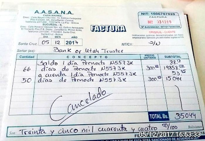 El asambleísta presentó las facturas 031283, 031284 y 031289, giradas por Aasana a nombre de Ricardo Javier Torres Mayet y del Bank of Utah Trustee, emitidas entre el 4 y 5 de diciembre de 2017, mediante las cuales se evidencia que los propietarios pagaron en total Bs 68.044 por la permanencia de la aeronave en suelo boliviano.