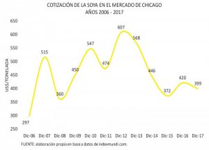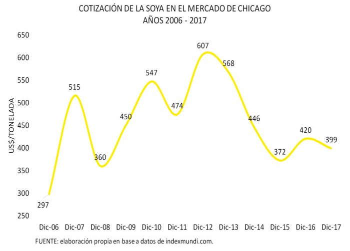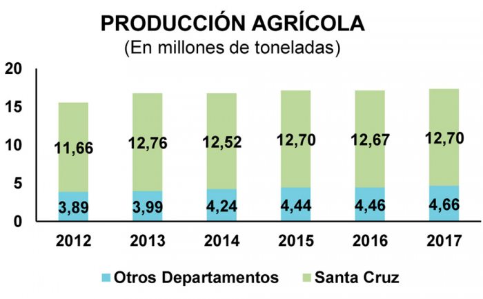 La producción agrícola se paralizó en los últimos seis años, descendiendo a 12.7 millones de toneladas promedio. Los productos industriales (soya) representaron en el mismo período 10.5 millones, equivalente al 82 por ciento del total.