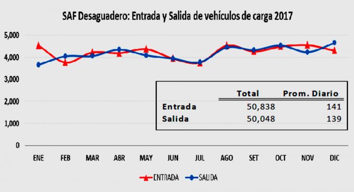 Entre abril y mayo de este año, unos 130 camiones utilizaron la infraestructura, mientras que en ese mismo período el movimiento de vehículos turísticos llegó a otro número similar. La terminal de vehículos pesados tiene una capacidad en carga para 116 estacionamientos (80 carga impo/expo y 36 carga tránsito), asimismo en la terminal de pasajeros se tienen 120 estacionamientos.