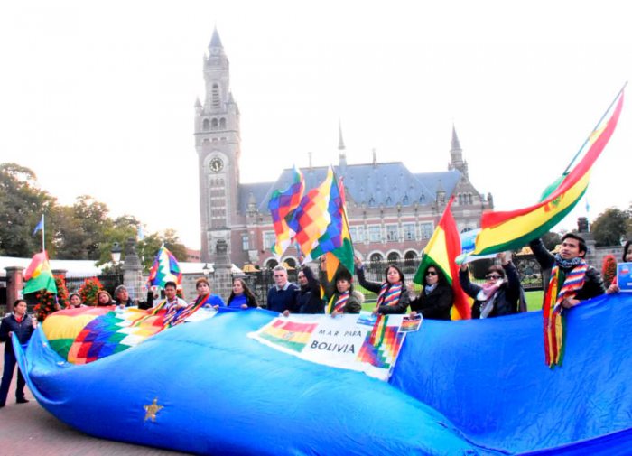 “¡Entonemos la canción del mar, del mar del mar, que pronto nos llevará a la dicha y bienestar, levantemos nuestra voz por nuestro Litoral, que pronto tendrá Bolivia otra vez su mar, su mar!”, fue el canto que entonaron los connacionales a las puertas del Tribunal.