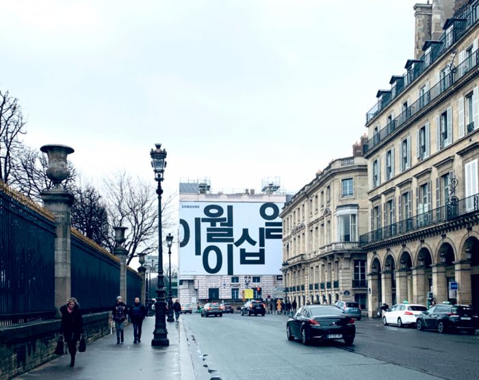 Los carteles publicitarios, que se han instalado en la famosa Place de la Concorde de París, combinan hermosas imágenes con texto escrito en Hangul, el alfabeto coreano. La traducción de los mensajes intrigantes “미래 를 펼치다” y “ì´ì›” ì´ì‹ì¼” es: “El futuro se despliega” y “20 de febrero”.