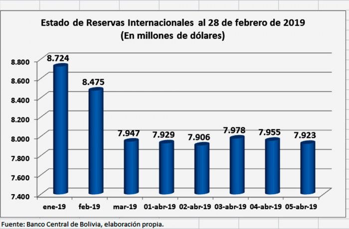 En enero de la presente gestión, las Reservas estaban en 8.724 millones de dólares, mientras que en febrero bajaron a 8.475 millones y en marzo llegó a 7.947 millones.