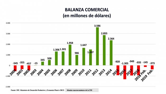 De acuerdo con la CNI, el incremento de las importaciones y el descenso en el valor de las exportaciones en los dos primeros meses de 2019 generaron una suba en el déficit comercial con el consiguiente efecto sobre el descenso en el valor de las reservas internacionales netas. Las exportaciones a febrero de 2019 descendieron a 1.315 millones, cuando en febrero de 2018 se situaron en 1.388 millones; por su parte, las importaciones subieron a 1.688 millones a febrero de 2019 cuando se ubicaron en 1.533 millones a febrero de 2018.